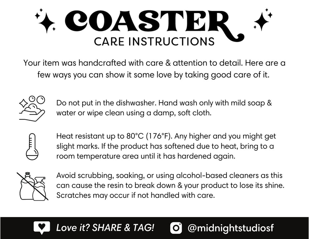 All pieces are made entirely by hand, and as a result small imperfections such as bubbles and rough edges may be present. These are a natural part of the making process and should be considered a unique feature of your handmade product.